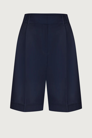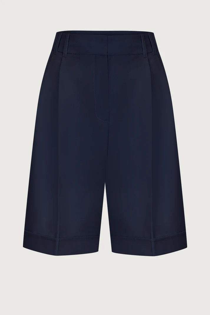 High-waisted Bermuda shorts crafted from a soft, lightly structured fabric with an oversized fit. Designed with pressed creases, side pockets and wide turn-ups at the hem. Finished with a hidden front closure and belt loops.