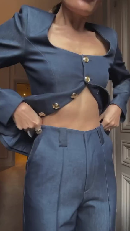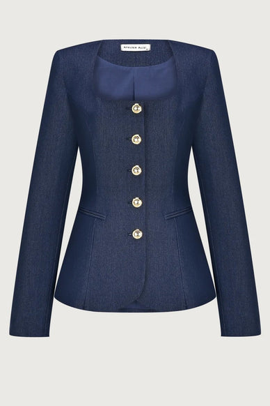 Tailored blazer featuring a refined square neckline and statement gold-tone buttons. Cut from a structured fabric with light stretch for a flattering fit. Finished with front welt pockets.