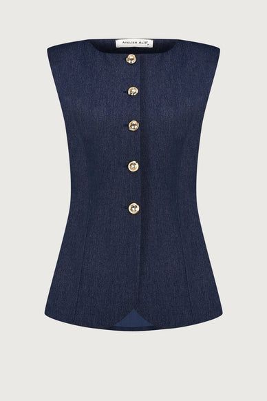 Tailored sleeveless top crafted from a structured fabric with a soft touch. Designed with a rounded neckline, front button closure and sculpted seams for a flattering silhouette. Finished with curved front edges.