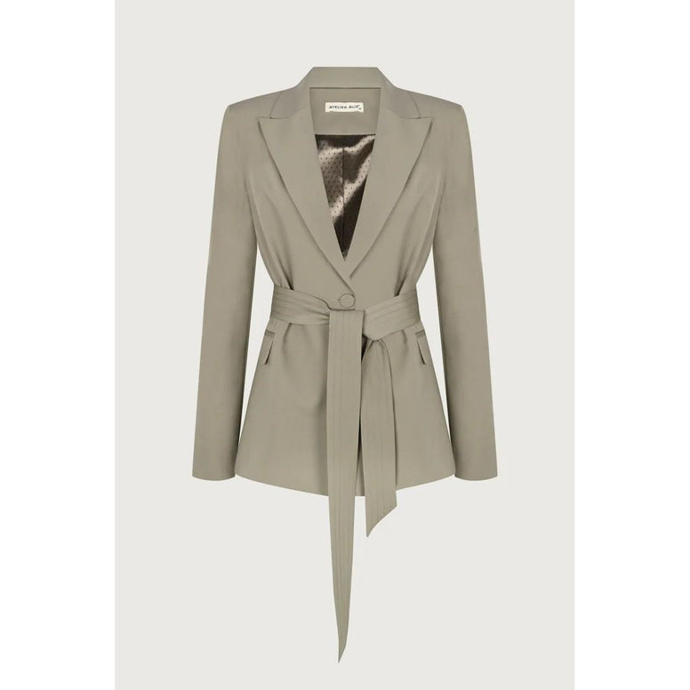 Tailored blazer with classic lapels and a defined waist, cinched with a matching fabric belt. Designed with snap fastening, flap pockets and a back vent. Fully lined.