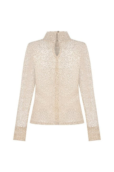 Sequined blouse with a high standing collar and cuffs, crafted from 100% polyester for a structured yet elegant look. The collar and cuffs close with classic button-through detailing.