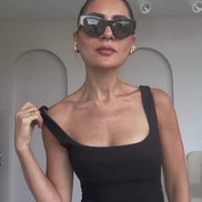 Square-neck, strappy pencil dress tailored from a soft, structured blend fabric. Designed with a defined cup detail on the front panel. Features a back slit, concealed zipper, and a self-fabric belt for a clean, cohesive silhouette.